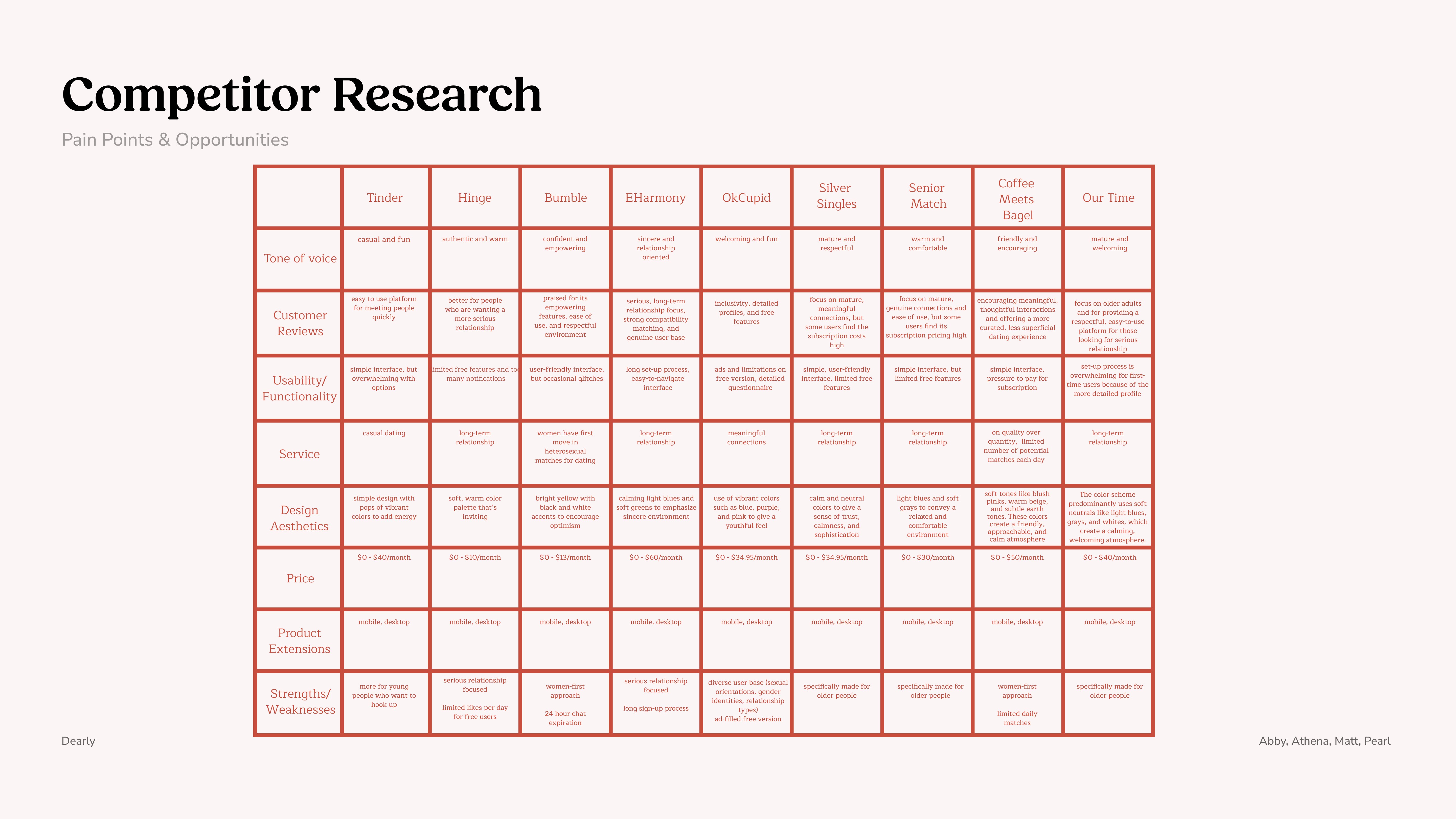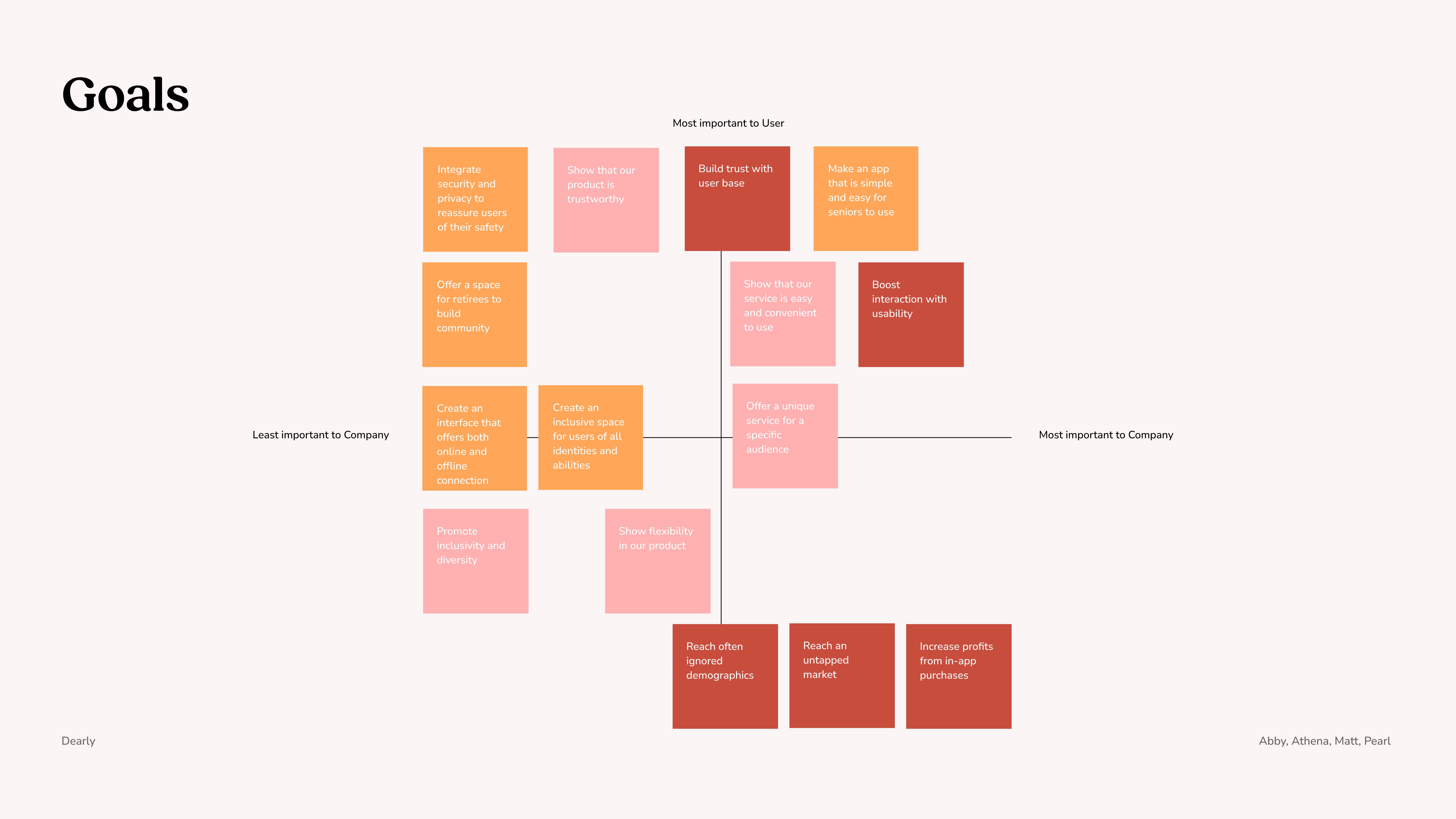 We created Dearly, the dating and community building app for seniors who need a way to build relationships by offering a variety of ways to connect with others while prioritizing safety, inclusivity, and ease of use.