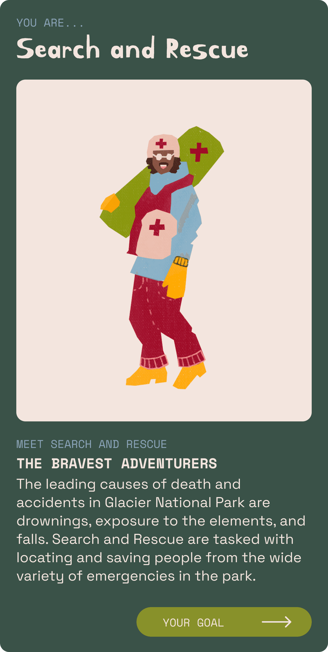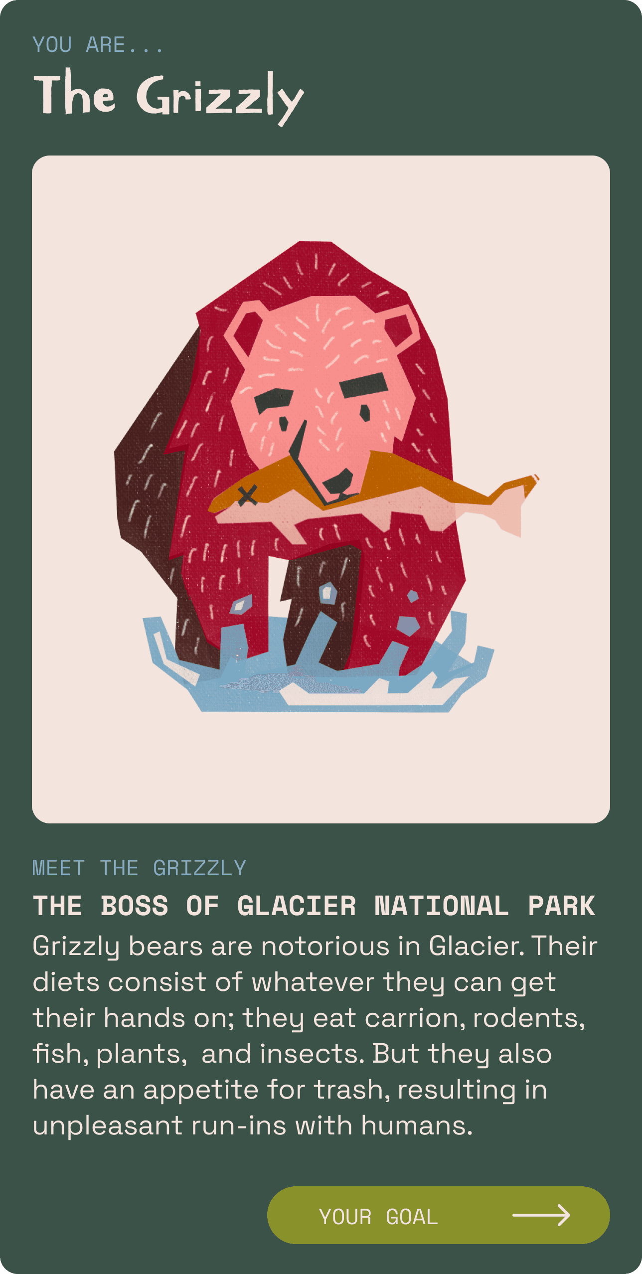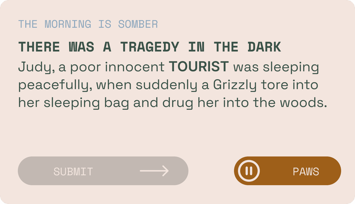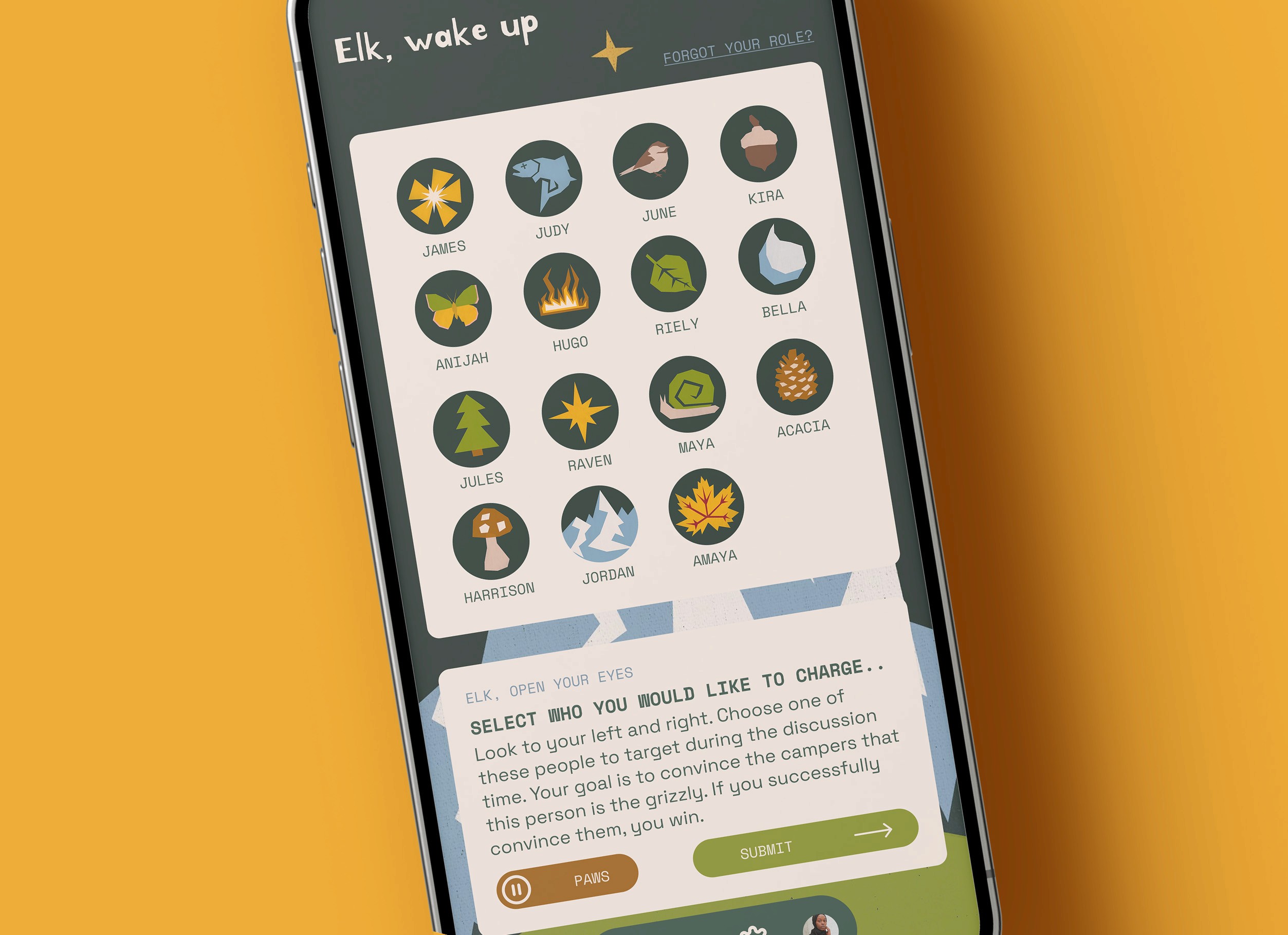 I created an app that allows users to explore stories through game play. The Night of the Grizzlies is a social deduction game geared towards young adults who need an imaginative game that offers beautiful game design and prioritizes simplicity, education, and diversity.